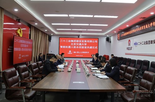 张育鹏代表中国二十二冶集团对交大一行表示欢迎,并强调将以联合实验室为平台,推动机器人技术与二十二冶集团主营业务应用场景深度融合。蔡小培表示,北京交通大学将充分发挥科研与人才优势,与二十二冶集团共同打造产学研用一体化的创新高地。